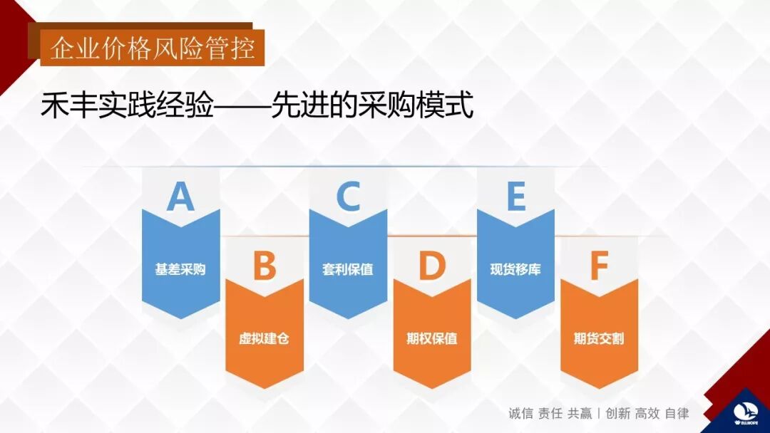 E、现货移库。这是建立在优质供应商和优质客户之间的一种风险规避行为。我们和九三之间做过,除了现货移库以外,还有基差移库,这是对双方都没有任何风险的,利用衍生手段实现现货使用,未来确定价格的方式,这个方式对于禾丰这样的大规模采购并且对未来的价格有自己明确预期的情况是非常有意义的。