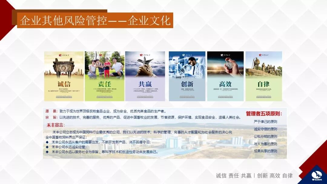 《禾丰宗旨》也是写于禾丰成立的1995年,但是即使在10年前,我们都不敢告诉外界,因为我们觉得太小的公司好像没资格说要造福人类社会,但是在每次内部会议上都要讲。今天并不是禾丰有资格讲了,而是禾丰更有勇气讲了。希望禾丰未来发展得更大、更好、更高质量,真正有资格讲。不管有没有资格讲,但是我们有愿望讲,这就是我今天跟大家分享的农业企业的风险控制。