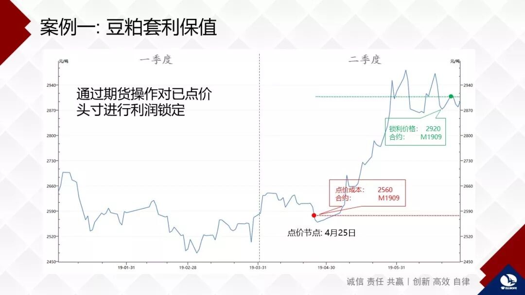 讲三个小例子。第一通过期货操作对豆粕已点价头寸进行利润锁定。今年4月25日价格低点2560的时候果断点了4万吨,到了5月末价格长期在2850左右徘徊,我们觉得高点已经到了,到6月初2920,我们就在盘面卖出去了。就这一个操作每吨净利360元,4万多吨,一次操作大概1800万的利润。
