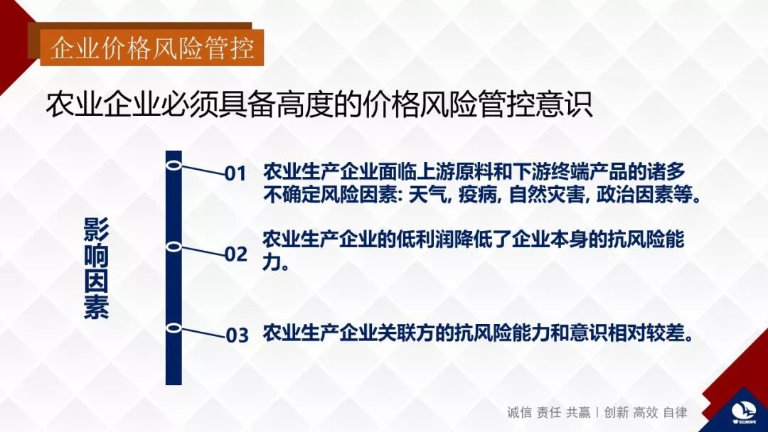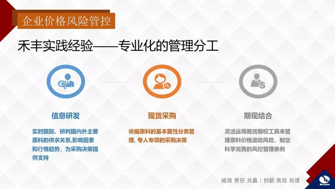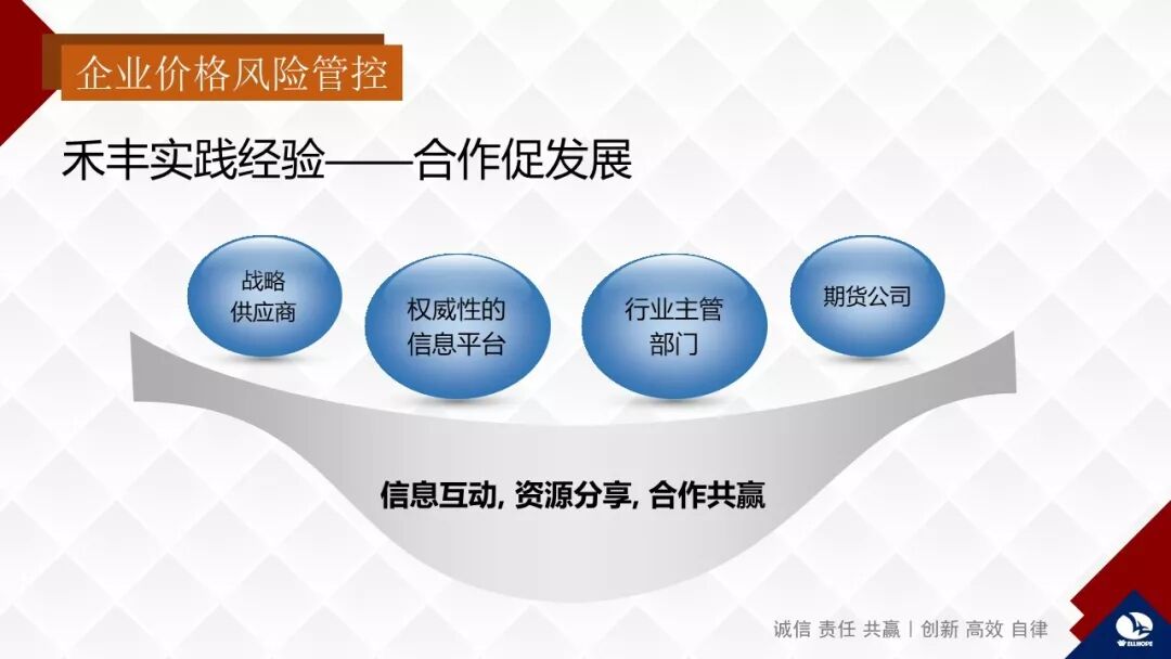 企业对原料价格的风险管控,重点是利用金融衍生工具、期货等手段规避价格风险。刚才李理事长做了一个非常专业的演讲,使我做这个报告的压力减轻了。其实企业风险无处不在。近年禾丰频繁到国外投资建厂,合资企业的英文是JOINT-VENTURE,这个英文让我意识到企业本身就是在经营风险、识别风险、驾驭风险、把控风险,就是化风险为机遇。