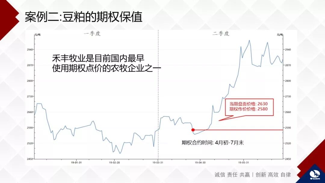 第二是运用期权的方式买豆粕,我们在东北市场做了上述的操作。在东北以外市场,我们在期货市场价2630的时候,通过使用组合期权获得比市价更低的2580的点价头寸。虽然略高于东北企业的2560,但是我们永远不要期望决策在最佳点,我觉得次佳点也是非常好的。如果企业总是次佳选择那总体就是最佳选择,就像我们找夫人,不一定找到一生最适合我们的,但是找到第二、第三适合我们的也是成功的,人生不能偏执地寻求最佳,否则会一辈子孤家寡人。这次运用期权的手段,我们没有付费,通过冒了一个小风险,把价格赌给对方,好像一个赌博,但这个小赌博也换来了