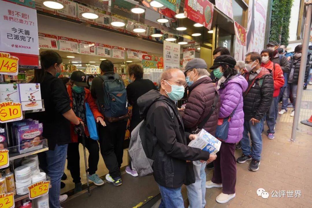 ▲香港民众在化妆品连锁店外等候购买口罩