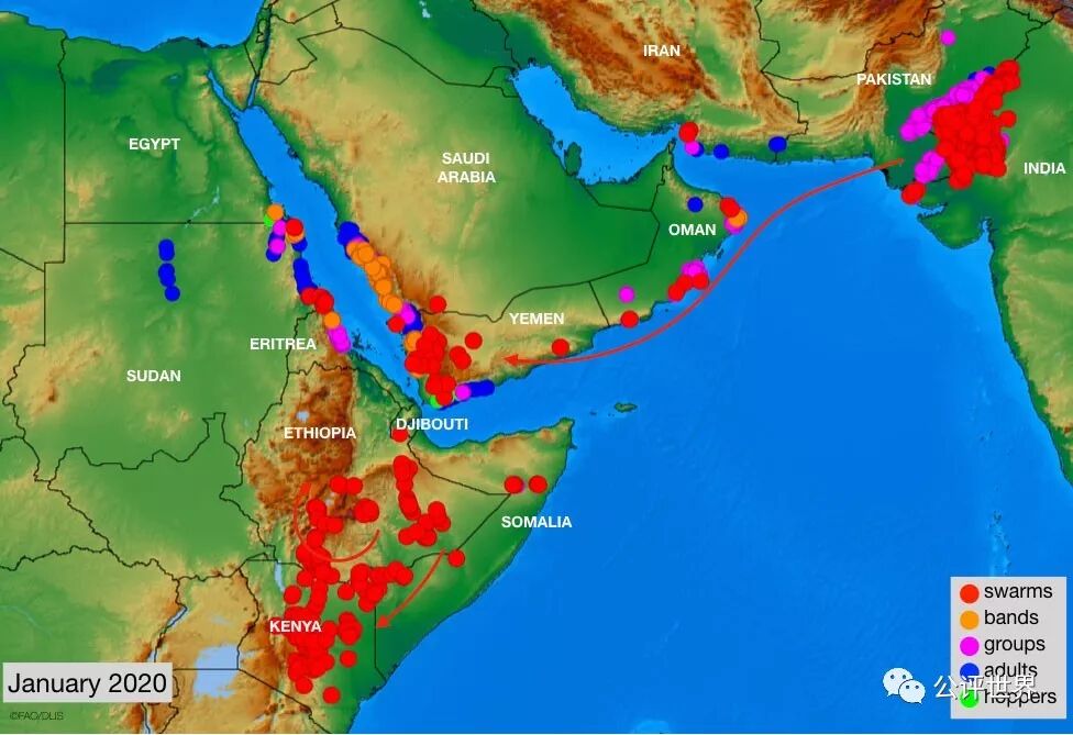 ▲联合国粮农组织最新公布的蝗灾影响情况地图(数据截至1月底)