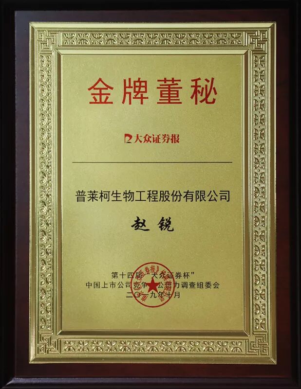 2019年10月18日,由大众证券报主办的“致敬新中国 70 华诞、寻找经济增长新动能”——第十四届中国上市公司竞争力公信力调查评选颁奖高峰论坛在成都举行,会上,普莱柯公司被评为“最佳创新上市公司”,公司董事会秘书赵锐被评选为“金牌董秘”。